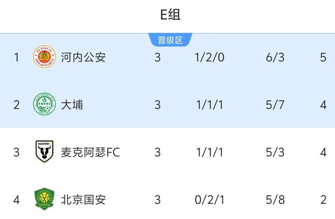 3轮过后的小组排名,国安2平1负仅积2分仍然排在小组垫底,河内公安则1胜2平的不败战绩积5分继续排在小组第一,大埔队和麦克阿瑟FC同积4分分列第2和第3。